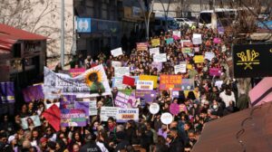 Jinên ku beşdarî meşê bûn pankarta “Li dijî xizanî, şîdet, kedxwarî û şer, em jin di serhildanê de ne” vekirin.