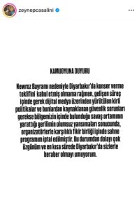 🔴AMED – Hunermend Zeynep Casalini ya ku dihat payîn di pîrozbahiyên Newroza Amedê de derkeve ser dikê, piştî bertek û nîqaşên li ser medyaya civakî, ragihand ku ew ji bernameyê vekişiyaye.